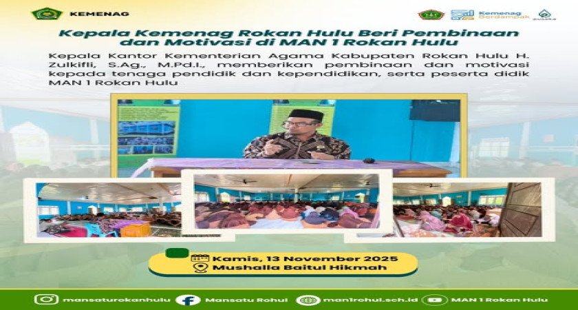 Rokan Hulu (Kemenag) — Kepala Kantor Kementerian Agama Kabupaten Rokan Hulu, H. Zulkifli, S.Ag., M.Pd.I., memberikan pembinaan dan motivasi kepada tenaga pendidik dan kependidikan, serta peserta didik MAN 1 Rokan Hulu, pada Kamis (12/11/2025) di Mushalla Baitul Hikmah.