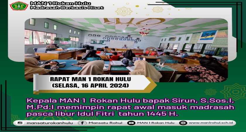 Pasca Libur Idul Fitri, MAN 1 Rokan Hulu mengadakan rapat awal masuk madrasah untuk mempersiapkan kembali kegiatan belajar mengajar (KBM) serta membagi tugas-tugas penting kepada seluruh staf dan guru. Rapat yang diadakan pada hari selasa 16 April 2024 ini membahas berbagai hal terkait dengan pengelolaan madrasah pasca libur, termasuk pembagian tugas dan informasi lainnya.