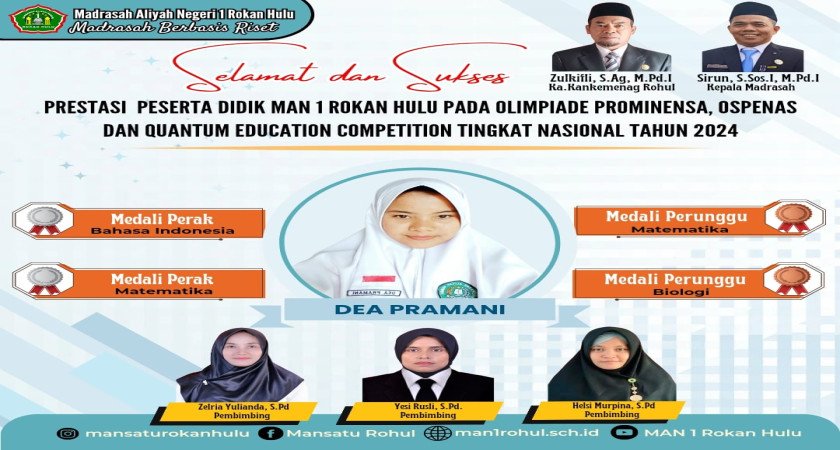 Selamat dan Sukses kepada Dea Pramani peserta didik MAN 1 Rokan Hulu yang meraih prestasi pada ajang Olimpiade Prominensa, Ospenas dan Quantum Education Competition tingkat nasional tahun 2024.