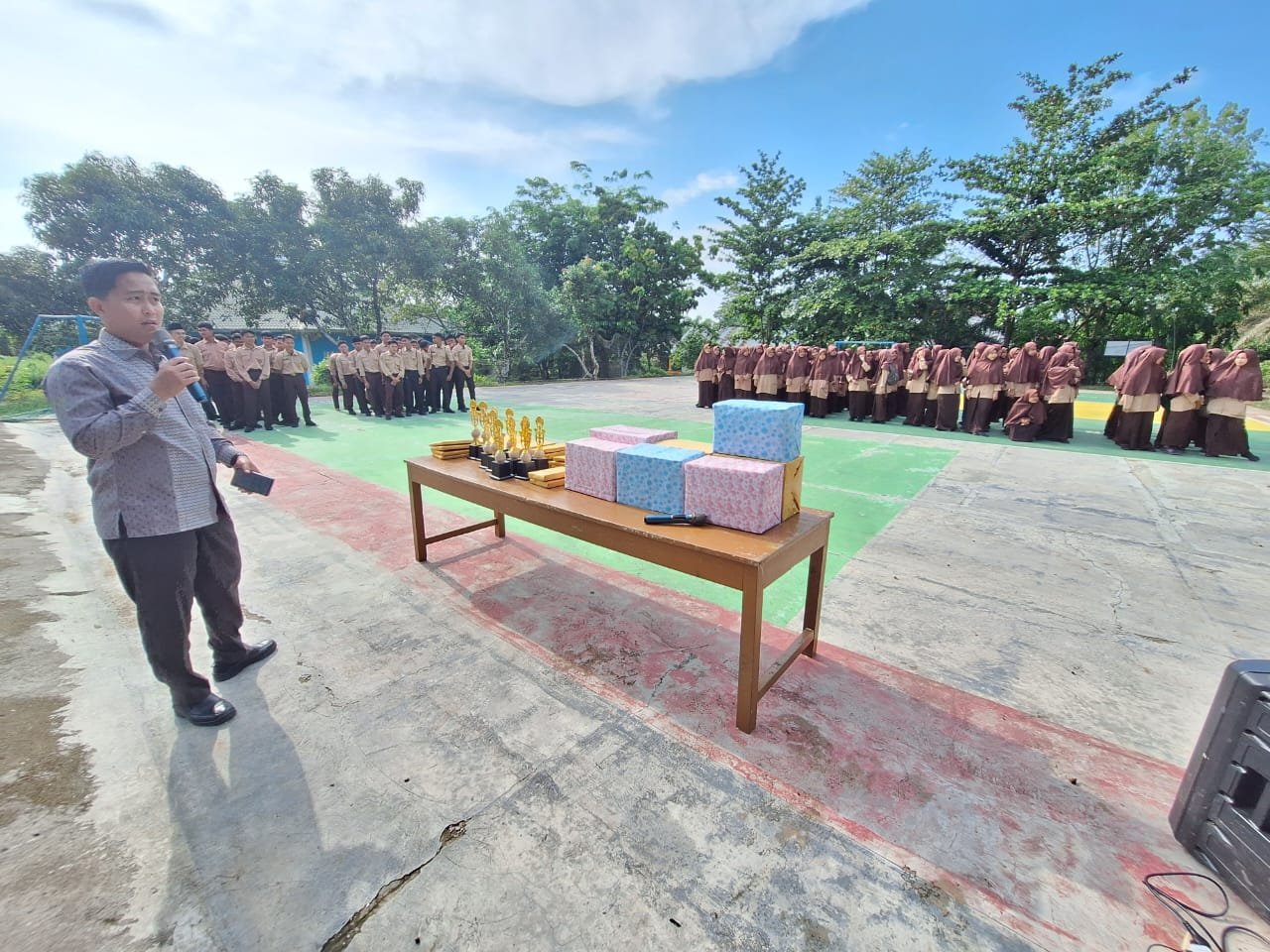 Kemenag (Rokan Hulu) – MAN 1 Rokan Hulu menggelar acara pembagian raport dan hadiah kepada siswa berprestasi semester genap tahun pelajaran 2023/2024 pada hari Jum’at (21/06/24) di lapangan olahraga madrasah.